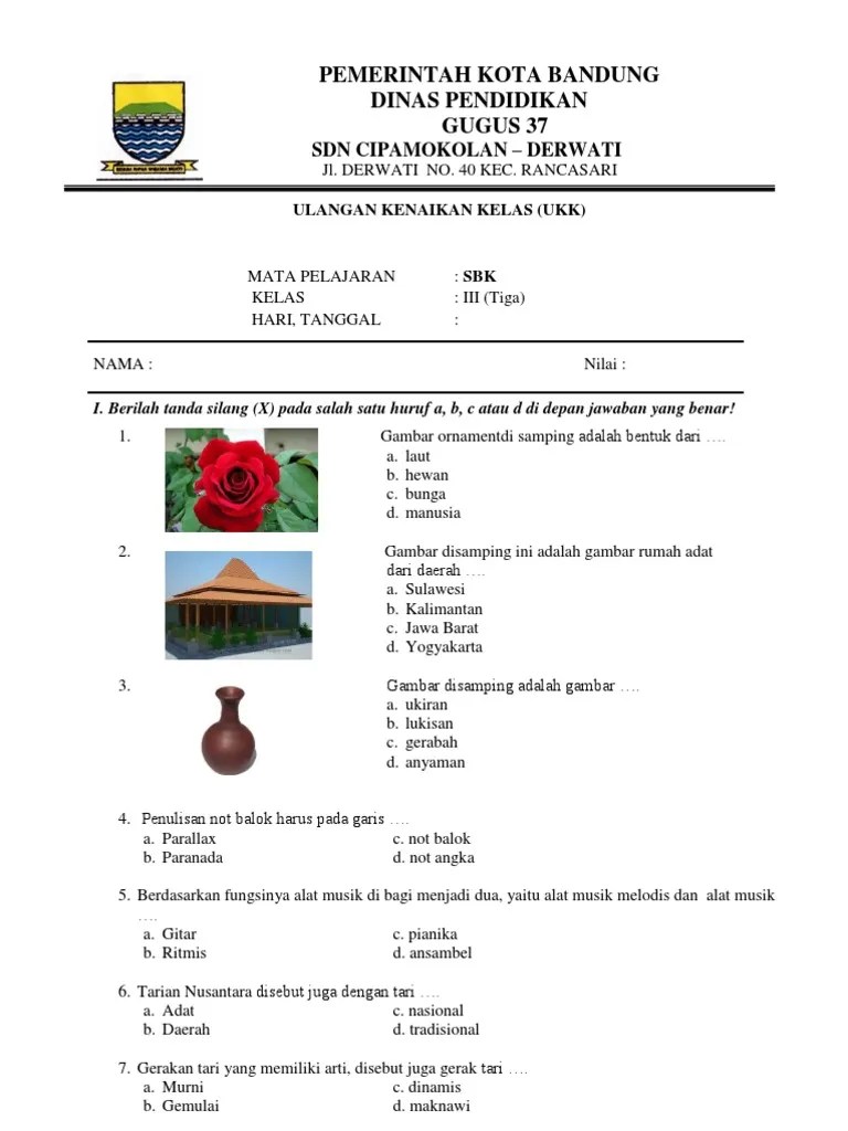 You are on page 1 of 3. Ulasan file dan info berikut ini adalah kumpulan dari berbagi sumber tentang soal uts sbk kelas 5 semester 2 dan kunci jawaban yang bisa bapak/ibu gunakan dan diunduh secara gratis dengan menekan tombol download biru dibawah ini. Ulangan sbk kelas 5 semester 2 www.mautidakmauharusmau.blogspot … Kementerian pendidikan nasional kartu soal ujian sekolah (us) lainnya tahun pelajaran 2017/2018 jenis sekolah : Letakkan tanda silang x di depan huruf a b atau c sebelum jawaban yang benar. Seperti yang tertera bahwa diakhir semester pasti akan diadakan sebuah evaluasi. Tak terasa tahun ajaran pada kalender pendidikan akan berakhir. Pilihlah abjad a, b, c, atau d sebagai tanggapan yang paling benar! soal seni budaya kelas 7 semester 2 dan kunci jawaban. Jangan lupa cek soal sbdp kelas 5 tentang gambar cerita lainnya! Semoga soal sbk kelas 5 semester 2 dan kunci jawabannya ini dapat bermanfaat. Terima kasih itulah soal uts/ pts tema 2 kelas 2 semester 1 kurikulum 2013 revisi 2018 yang bisa saya bagikan. Unsur bunyi keras dari alam bersumber dari ….