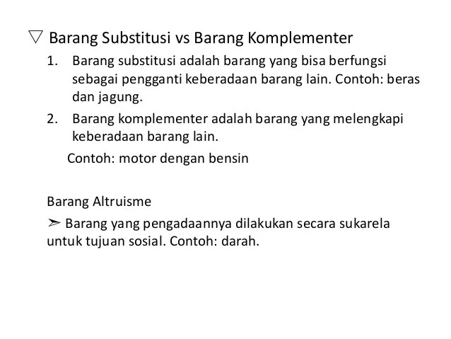 Contoh barang substitusi · pulpen dan pensil · nasi dan mie instan · laptop dan komputer · santan kelapa dan santan kemasan · premium dan pertalite. Keluarga · beras diganti dengan jagung atau singkong · minyak tanah diganti dengan gas lpg · nasi diganti dengan mie instan · minyak goreng diganti . Barang subsidi, yaitu barang yang dapat dijadikan sebagai pengganti dari barang lain yang memiliki nilai guna yang sama. Barang substitusi merupakan barang yang bisa saling digantikan , salah satu contohnya adalah beras dan jagung. Pulpen dan pensil · 2.